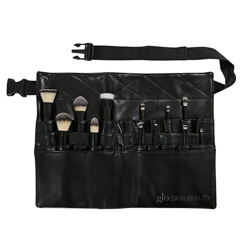 Glo Skin Beauty Brush Belt contains 28 pockets, allowing the artist to move around freely while carrying a variety of brushes, tools, and accessories comfortably around their waist. It comes with an adjustable strap and is made from a soft, leather-like Polyurethane material.